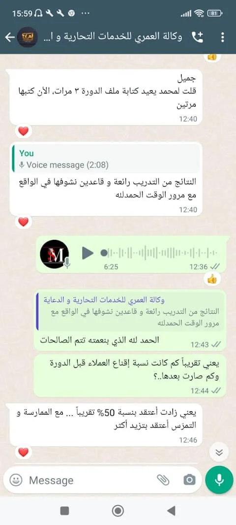 شكرًا على هذا الدورة التدريبية! خلال ثلاث جلسات، استفدت من توجيهات وإثراء كبيرين في مجال التسويق وبيع الخدمات. أنتظر بفارغ الصبر المزيد وتطبيق الأفكار التي تعلمتها