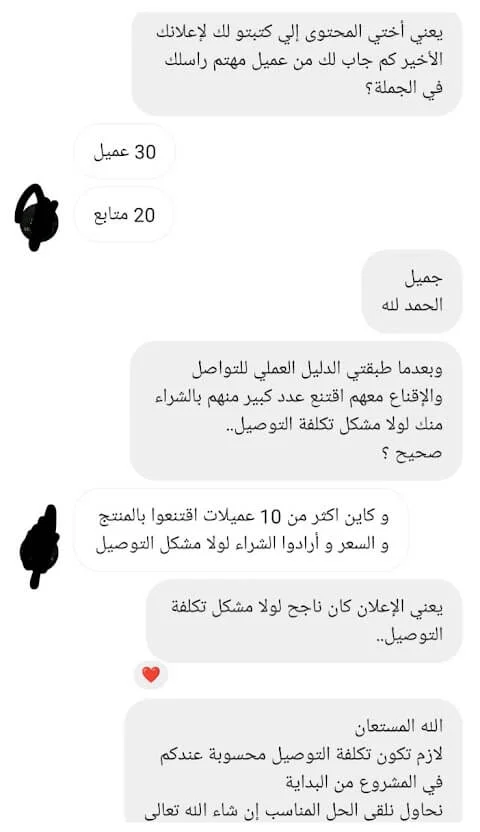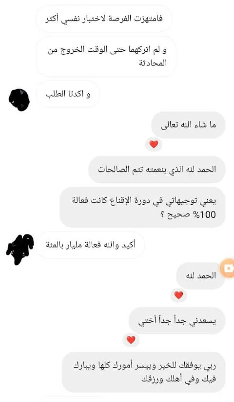 الصراحة من أصعب المواقف الي مرت علي هي اغلاق البيع مع المهتمين بخدماتي اثناء المكالمة معهم، وما كنت اعرف بالضبط ايش هي الطريقة الصحيحة لاقناعهم بالخدمات الي اقدمها لهم.. لكن بعد الجلسة معك ما شاء الله اصبحت الامور أكثر وضوح وفي خطوات واسئلة مهمة تساعد في اقناع العميل وتحويله لمشتري.. شكرًا من الاعماق لأني بجد احس بثقة أكبر أثناء المكالمة الآن، وأكيد بتحقيق أهدافي في بيع الخدمات بشكل أفضل بإذن الله! وأكيد ما أستغني أبدًا عن خدماتك وتوجيهاتك فيما يخص بيع الخدمات بشكل عام.. النتيجة بعدها: الحمد لله الأمور بخير..وكسرنا حاجز 10.000$ هذا الشهر بفضل الله!