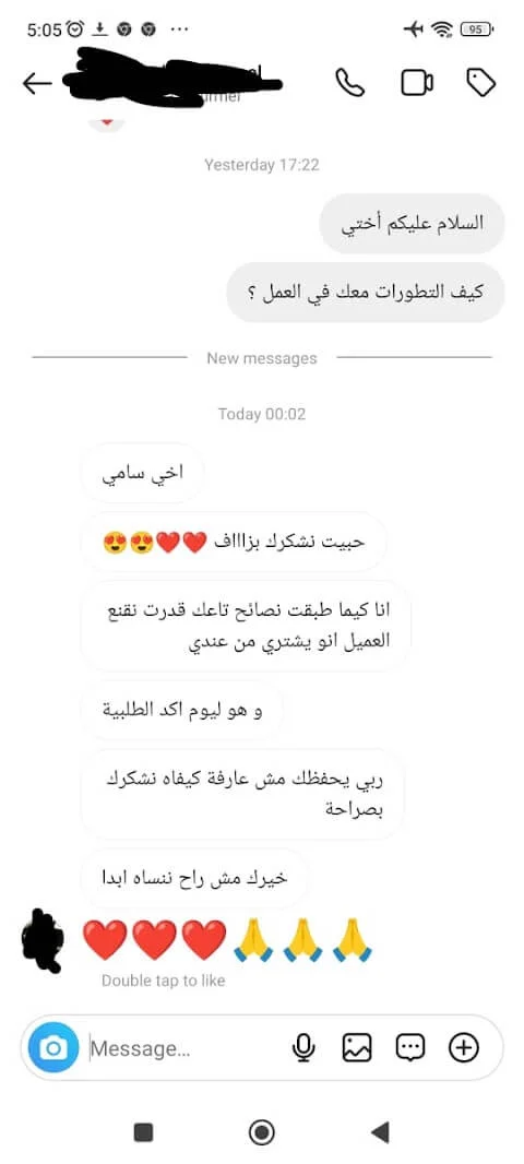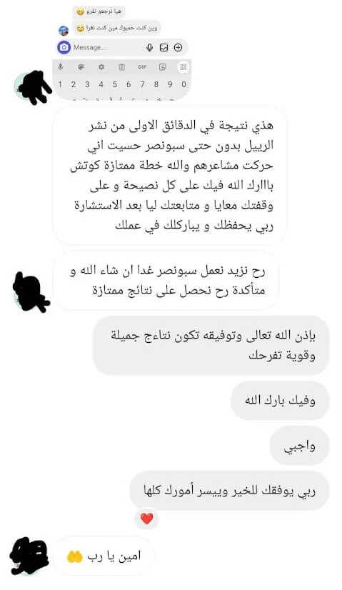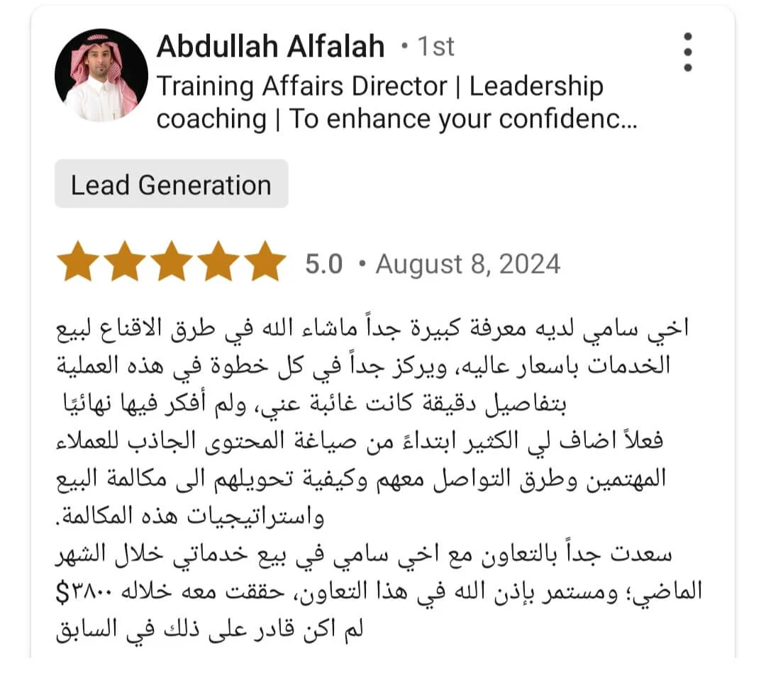 اخي سامي لديه معرفة كبيرة جداً ماشاء الله في طرق الاقناع لبيع الخدمات باسعار عاليه، ويركز جداً في كل خطوة في هذه العملية بتفاصيل دقيقة كانت غائبة عني، ولم أفكر فيها نهائيًا فعلاً اضاف لي الكثير ابتداءً من صياغة المحتوى الجاذب للعملاء المهتمين وطرق التواصل معهم وكيفية تحويلهم الى مكالمة البيع واستراتيجيات هذه المكالمة. سعدت جداً بالتعاون مع اخي سامي في بيع خدماتي خلال الشهر الماضي؛ ومستمر بإذن الله في هذا التعاون، حققت معه خلاله ٣٨٠٠$ لم اكن قادر على ذلك في السابق