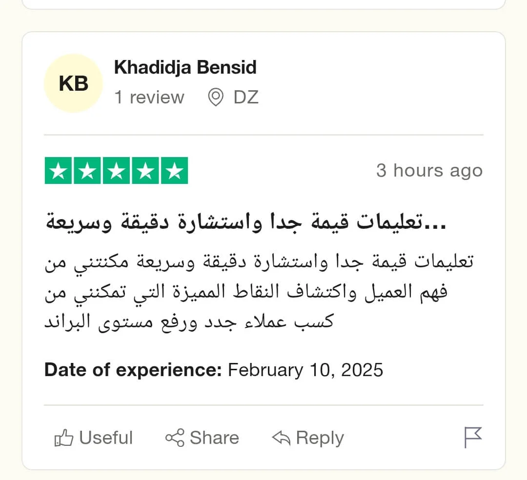 تعليمات قيمة جدا واستشارة دقيقة وسريعة مكنتني من فهم العميل واكتشاف النقاط المميزة التي تمكنني من كسب عملاء جدد ورفع مستوى البراند