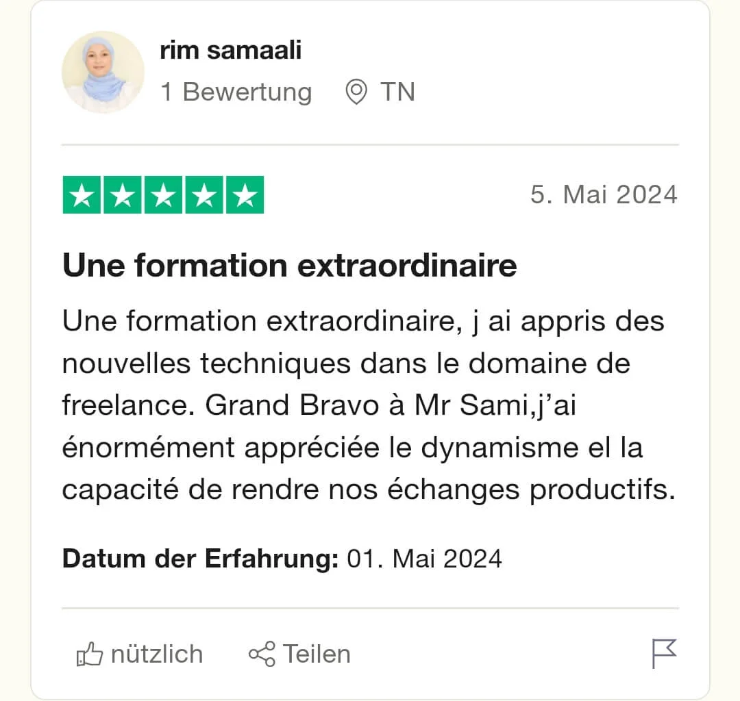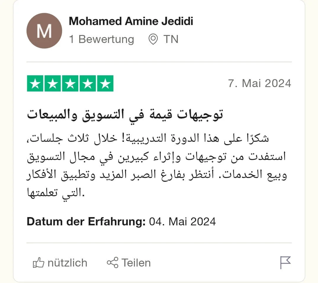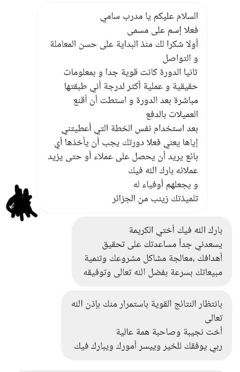 شكرًا على هذا الدورة التدريبية! خلال ثلاث جلسات، استفدت من توجيهات وإثراء كبيرين في مجال التسويق وبيع الخدمات. أنتظر بفارغ الصبر المزيد وتطبيق الأفكار التي تعلمتها
