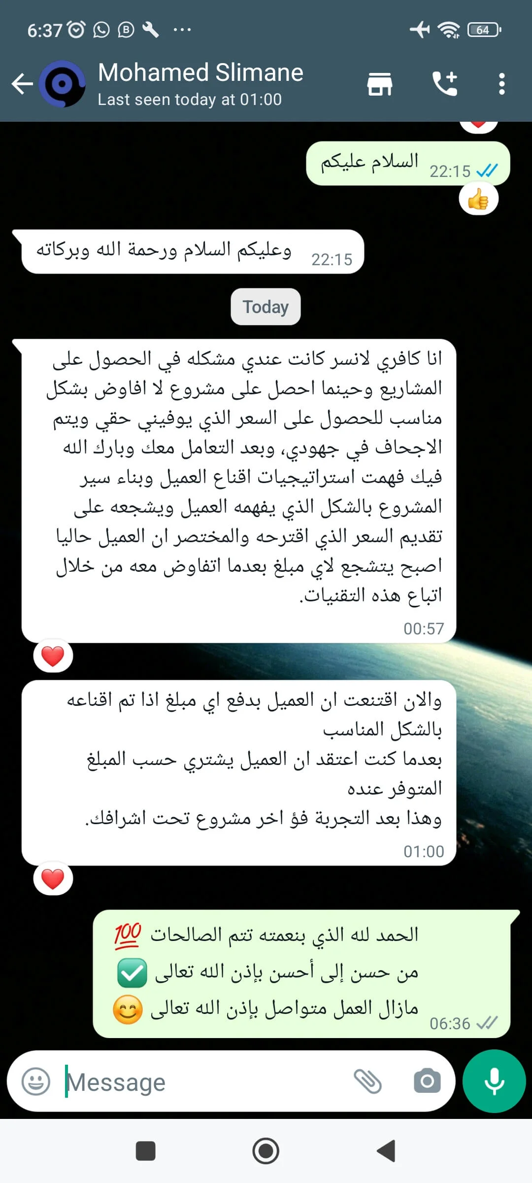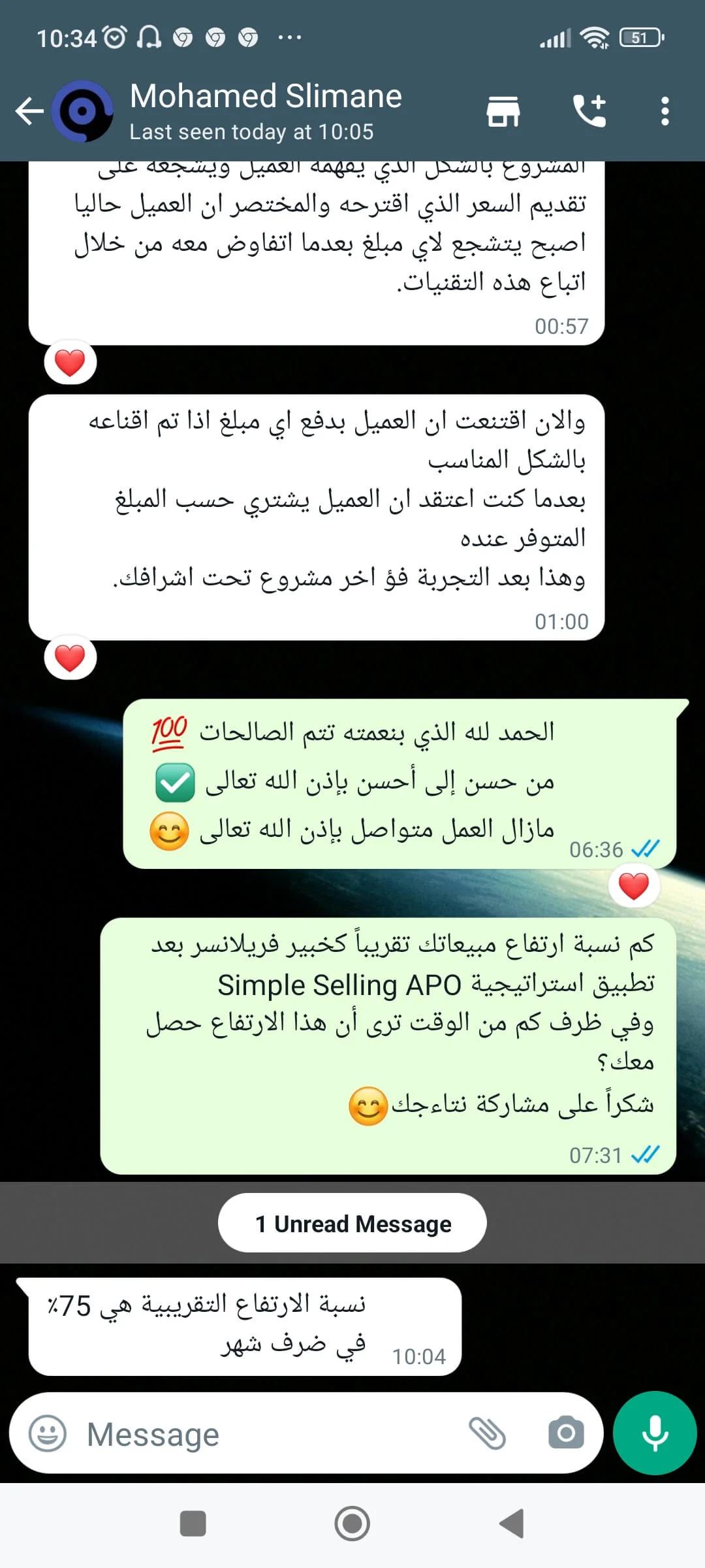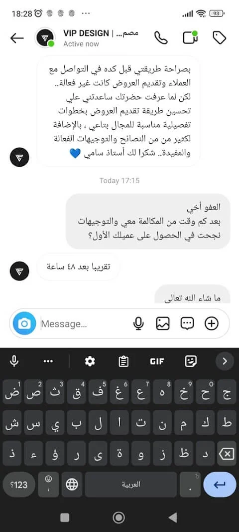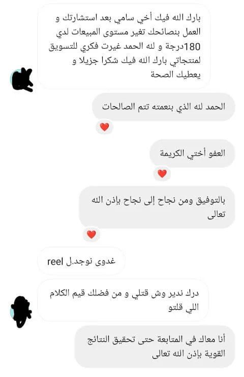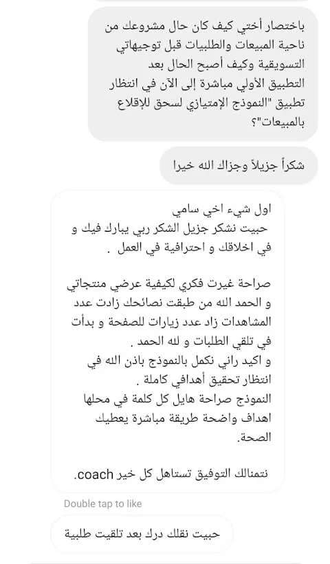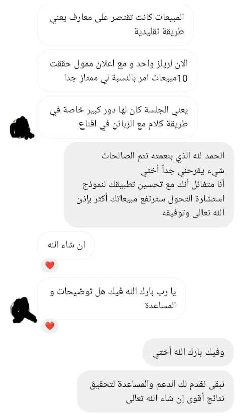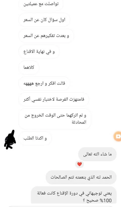 الصراحة من أصعب المواقف الي مرت علي هي اغلاق البيع مع المهتمين بخدماتي اثناء المكالمة معهم، وما كنت اعرف بالضبط ايش هي الطريقة الصحيحة لاقناعهم بالخدمات الي اقدمها لهم.. لكن بعد الجلسة معك ما شاء الله اصبحت الامور أكثر وضوح وفي خطوات واسئلة مهمة تساعد في اقناع العميل وتحويله لمشتري.. شكرًا من الاعماق لأني بجد احس بثقة أكبر أثناء المكالمة الآن، وأكيد بتحقيق أهدافي في بيع الخدمات بشكل أفضل بإذن الله! وأكيد ما أستغني أبدًا عن خدماتك وتوجيهاتك فيما يخص بيع الخدمات بشكل عام.. النتيجة بعدها: الحمد لله الأمور بخير..وكسرنا حاجز 10.000$ هذا الشهر بفضل الله!